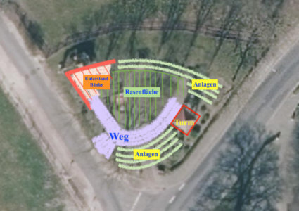 An der Straße Osteresch und zur Grenze der Weide des Hofes Robben-Wolters wird eine Fachwerkmauer erstellt. Von dieser Mauer wird Richtung Glockenturm eine Überdachung aufgebaut. In dem Bereich werden Sitzgruppen aufgestellt und ein Ladestation für E-Bikes installiert. Der Zugang zum Platz erfolgt von der Straße Osteresch.