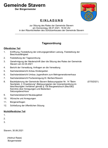 Die nächste Ratssitzung findet am Montag, d. 06.09.2021, 19.30 Uhr,